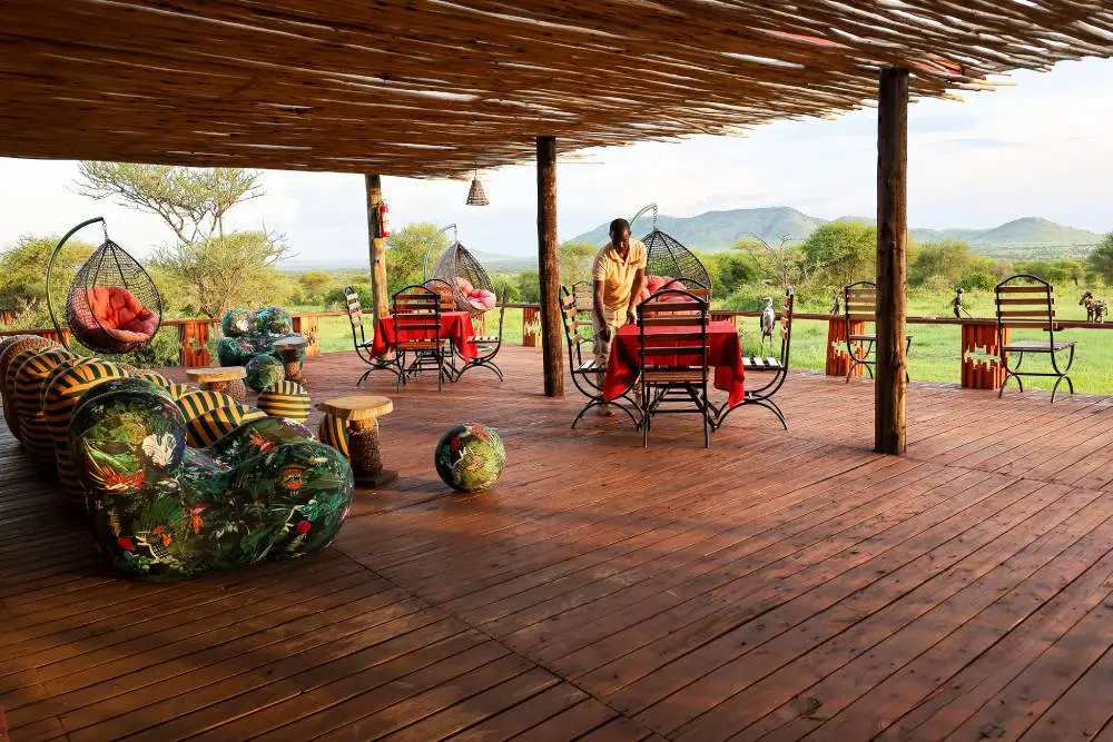 If you are looking for an authentic safari experience under traditional canvas showcasing spacious views and enriching culture, Mbali Mbali Tarangire River Camp is the perfect choice. Set within a 25,000-hectare concession area, Mbali Mbali Tarangire River Camp is located 3.5 km from the main entrance of the Tarangire National Park, overlooking a branch of the Tarangire River itself. Traditional grass thatching adorns the roof of the main lodge structure, which is set off the ground on an elevated deck. The breezy lounge boasts ample seating in a relaxing open-air environment. The dining area, where culturally inspiring meals are served, consists of simple safari style seating and the elevated position allows for excellent views over the riverbank below. Both the dining and lounge areas are married into a proper bon-fire area and game viewing deck that also overlook the same stunning views. The lodge’s small, informal gift shop offers the families of the nearby Maasai villages a chance to sell some of their handmade wares. All safari tents are equipped with private verandahs and en-suite bathrooms with toilet, shower and basin. Each safari tent has been built on an elevated wooden platform allowing for the movement of wildlife through the lodge and hence decreasing the interference of the lodge presence on the ecosystem. Thatched roofs keep the tents cool even at midday.