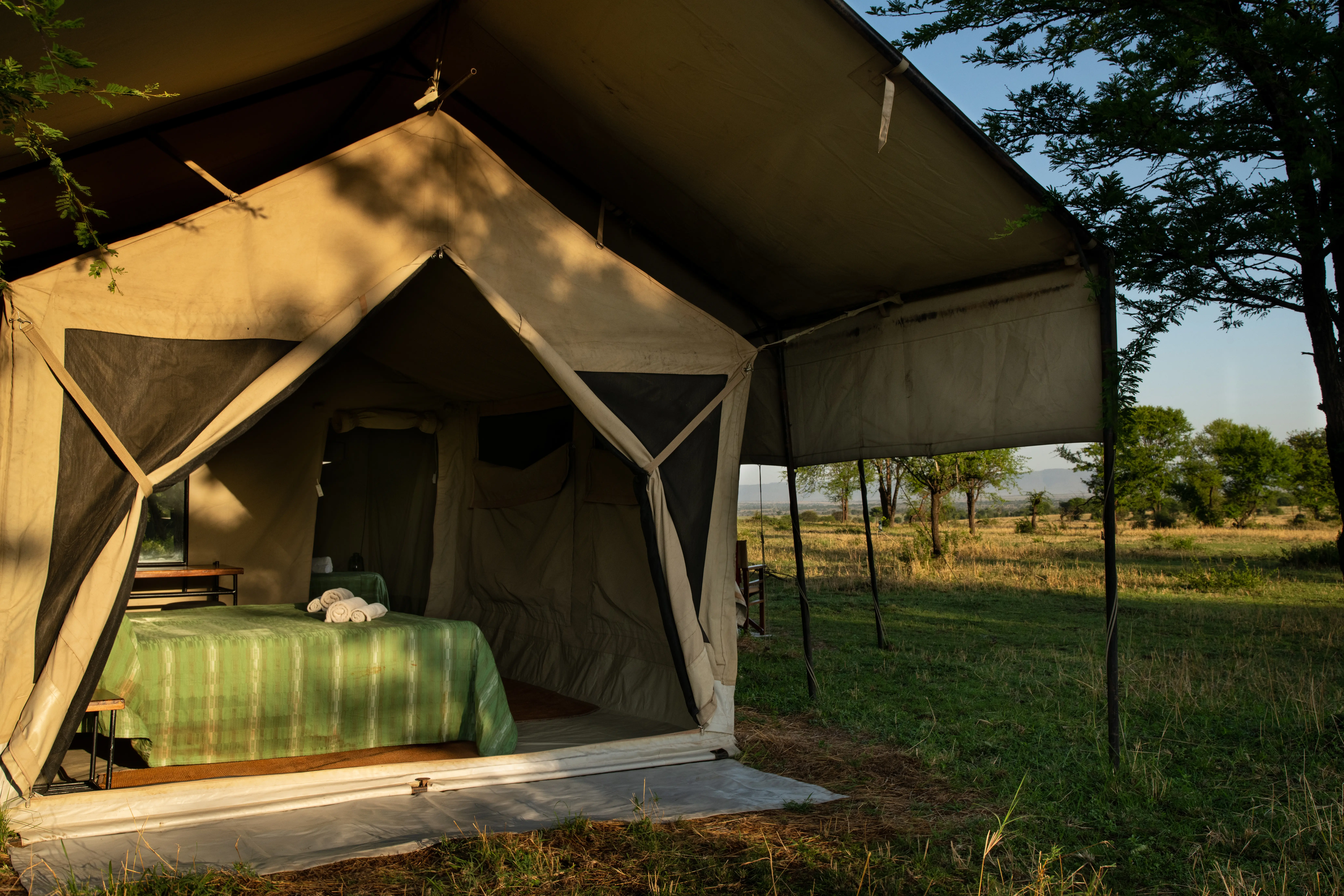 This is a semi-permanent campsite, which combines the comfort of a stable structure and the practicality of mobile camping. In fact, the site can be moved seasonally according to the number of animals present, to the rains, and other natural surrounding elements. Situated in the south of Serengeti, with beautiful views to the African Savannah, the location is the perfect spot to enjoy the migration from December to April. The camp enables the guest to experience an authentic African safari and at the same time offering the perfect balance between comfort, intimacy and splendid isolation. The camp is tucked away in the bush, shaded by acacia trees, and is furnished in safari style with simple ensuite bathrooms, it's ecofriendly as it runs on solar lighting, and consists of ten double spacious fully furnished tents and one family tent. The camp completes its facilities with a mess tent where meals are served and a lounge tent. Here is the perfect base for you to indulge your passion for animal viewing and wildlife photography without missing out on your creature comforts. Apart from the massive presence of animals, the area has unforgettable and uncontaminated natural landscapes.