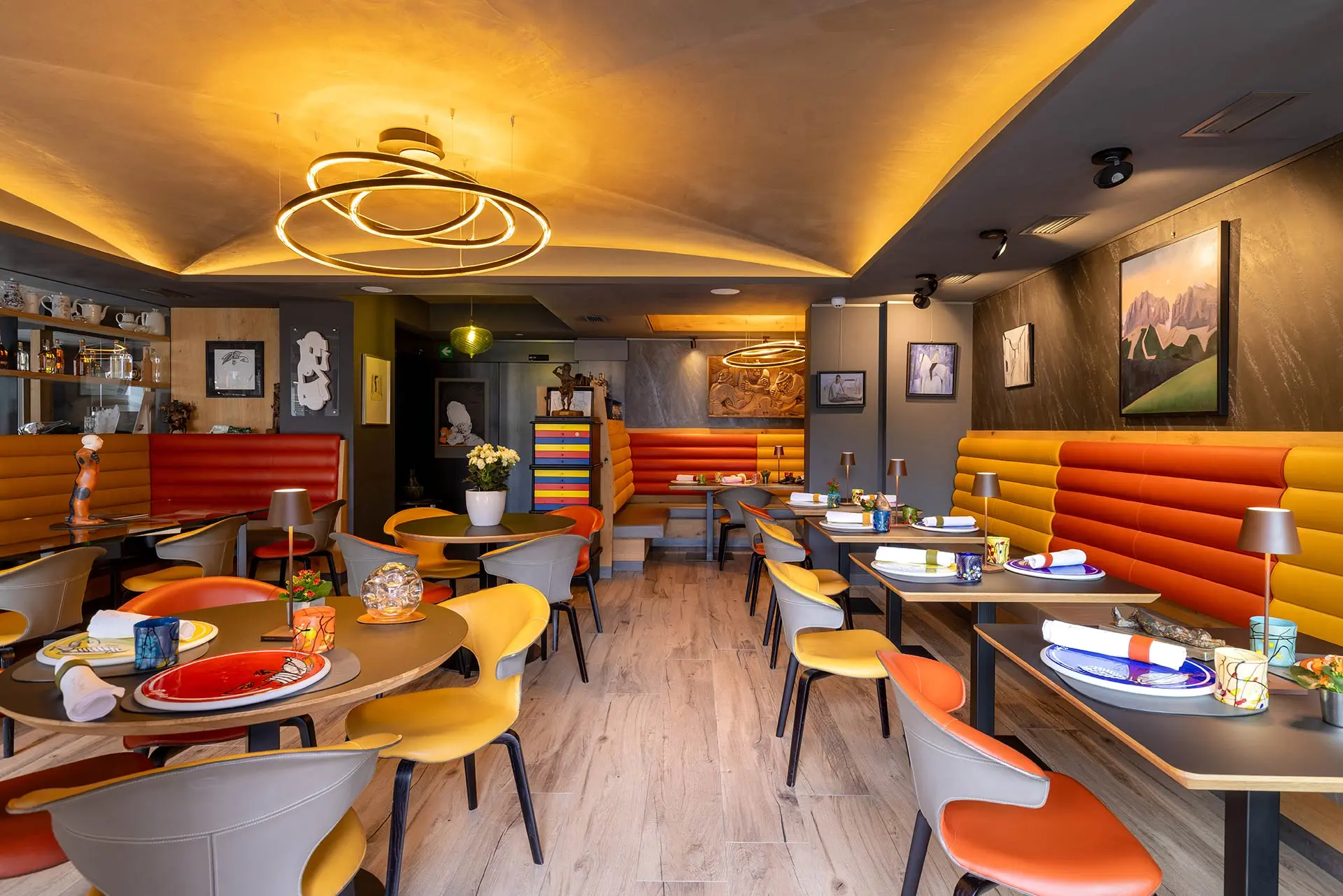 Locanda degli Artisti in Canazei feels less like a hotel and more like stepping into a living gallery tucked into the heart of the Dolomites, where every corridor, room, and quiet corner has been shaped with an artist’s eye. Set right in the village center, it carries this beautiful contrast between the lively alpine streets outside and the intimate, almost hushed world inside—where art, light wood, stone, and mountain views all blend into something deeply atmospheric. Each room is individually designed and dedicated to an artist, giving the feeling that you’re staying inside a curated story rather than a standard suite, with the peaks of the Dolomites always just beyond the windows. Evenings here tend to feel unhurried and warm—good food, soft light, and that unmistakable sense of being surrounded by something both creative and deeply rooted in place, where Canazei itself becomes part of the experience.